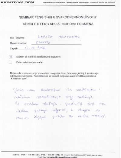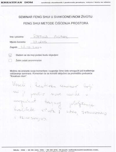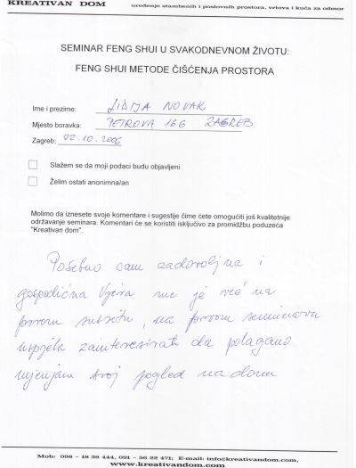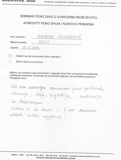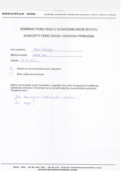 Vrlo dobro organizirano i dinamično predavanje. Sažeto na isključivo korisne upute sa kojima se odmah možemo služiti ili "igrati". Upravo ono što sam tražila, mada ostajem duboko zamišljena nad svojim prostorom i stilom života. Hvala.