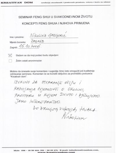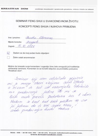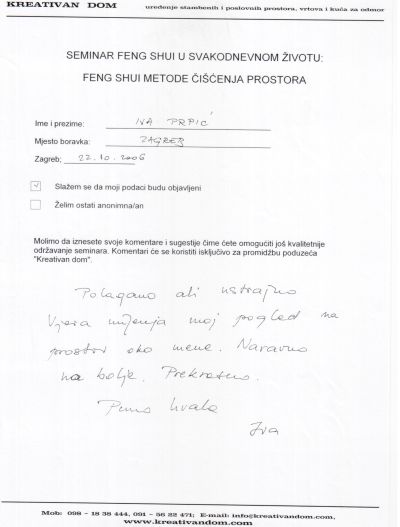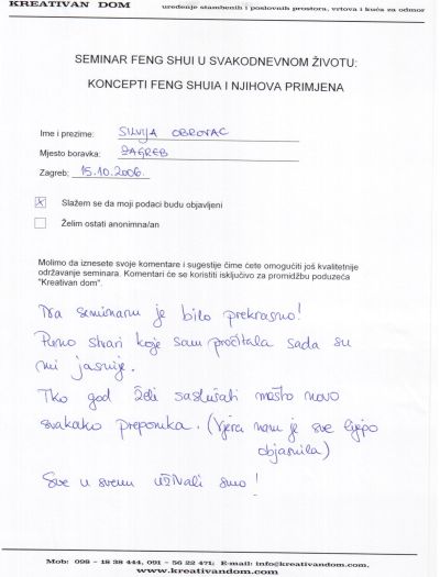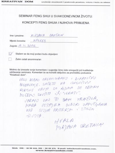 Vrlo dobro organizirano i dinamično predavanje. Sažeto na isključivo korisne upute sa kojima se odmah možemo služiti ili "igrati". Upravo ono što sam tražila, mada ostajem duboko zamišljena nad svojim prostorom i stilom života. Hvala.