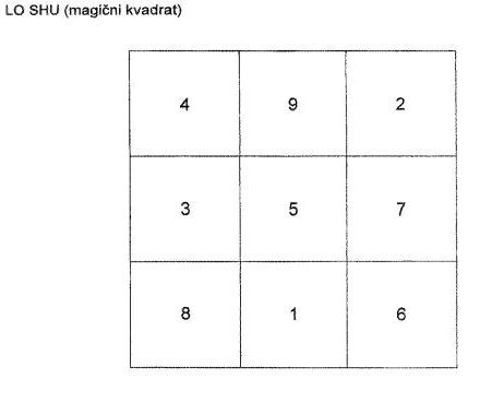 Prilkom analize tlocrta prostora koristimo Lo shu. To je kvadrat od devet polja. Svakom polju se pridaje određen broj od 1 do 9. Zbroj brojeva u tri polja u bilo kojem smjeru uvijek daje vrijednost 15. Stoga se ovaj kvadrat naziva "magični kvadrat". Lo shu je baza za analizu prostora, a isto tako ima značajnu ulogu u godišnjim i mjesečnim analizama letećih zvijezda.